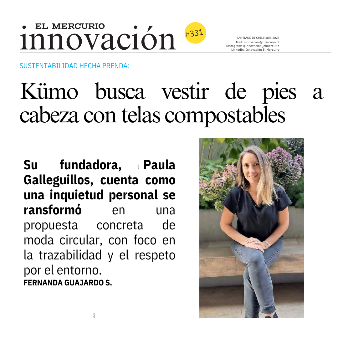 Su fundadora, Paula Galleguillos, cuenta como una inquietud personal se ransformó en una propuesta concreta de moda circular, con foco en la trazabilidad y el respeto por el entorno. En una industria dominada por la moda rápida y el consumo acelerado, Kümo propone una pausa consciente, un gesto de respeto por la tierra. Y lo ha- ce desde Chile, con una voz firme que apuesta por otra manera de vestir: una que, literalmente, vuelve a la tierra.